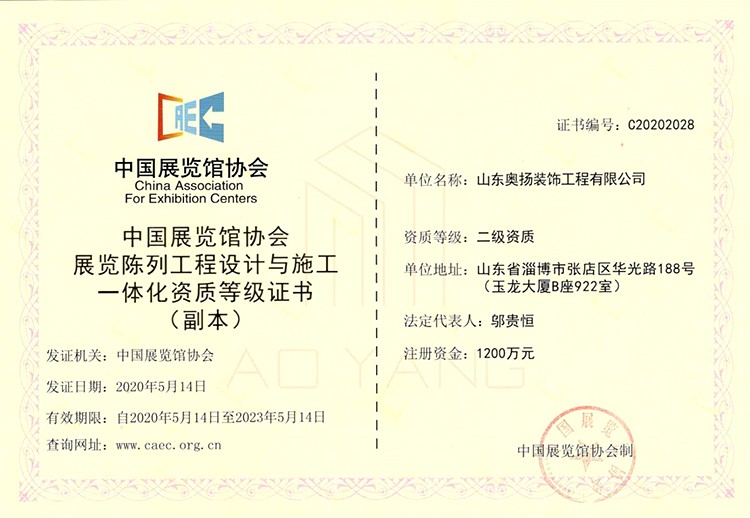 中國展覽館協(xié)會(huì)展覽陳列工程設(shè)計(jì)與施工一體化資質(zhì)等級(jí)證書
